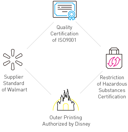 We meet the supplier standard of Walmart for packaging and printing, e.g., benefits for employees, equipment safety, impact on environment and the moral aspects of commercial behaviors as well as theh moral standards that include sanitation, safety, salary, working hours and discrimination, etc and the other two important indicators of anti-terrorism and competency of production processes.